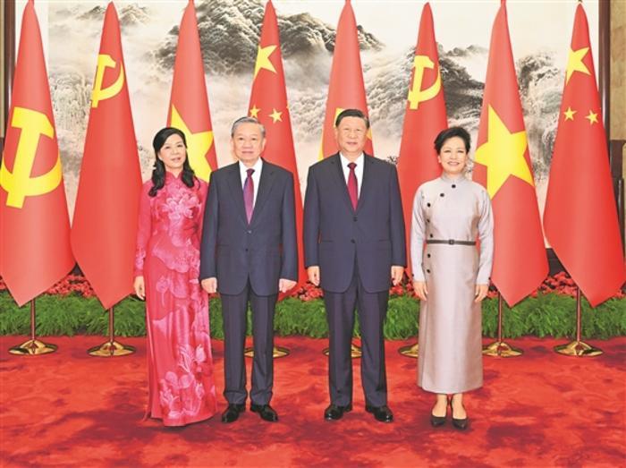 習近平指出,面對世界之變、時代之變、歷史之變,中越兩國保持經(jīng)濟快速發(fā)展和社會長期穩(wěn)定,彰顯了社會主義制度的優(yōu)越性和社會主義事業(yè)的生命力。中方將越南作為周邊外交優(yōu)先方向,支持越南堅持黨的領(lǐng)導,走符合本國國情的社會主義道路,深入推進革新開放和社會主義現(xiàn)代化事業(yè)。在各自國家發(fā)展振興的關(guān)鍵時期,中越要把準命運共同體建設(shè)的方向,夯實政治互信更高、安全合作更實、務實合作更深、民意基礎(chǔ)更牢、多邊協(xié)調(diào)配合更緊、分歧管控解決更好的“六個更”發(fā)展格局。中方愿同越方保持密切戰(zhàn)略溝通和高層交往,堅定相互支持,積極探討拓展共建“一帶一路”倡議和“兩廊一圈”框架對接合作,加快推進鐵路、高速公路、口岸基礎(chǔ)設(shè)施“硬聯(lián)通”,提升智慧海關(guān)“軟聯(lián)通”,攜手打造安全、穩(wěn)定的產(chǎn)業(yè)鏈供應鏈。以明年慶祝中越建交75周年為契機,共同舉辦好“中越人文交流年”等系列活動,鞏固兩國民意根基。雙方要秉持和平共處五項原則等國際關(guān)系基本準則,推動平等有序的世界多極化、普惠包容的經(jīng)濟全球化,維護國際公平正義和發(fā)展中國家共同利益,推動構(gòu)建人類命運共同體。