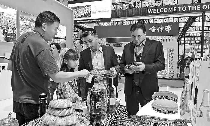 在新疆喀什會展中心的塔吉克斯坦展位,參加第十四屆中國新疆喀什·中亞南亞商品交易會(簡稱“喀交會”)的外國展商,邀請前來參觀的各界人士品嘗美酒。塔吉克斯坦是本次交易會特邀主賓國,帶來了酒水、干果、服飾等眾多特色商品。