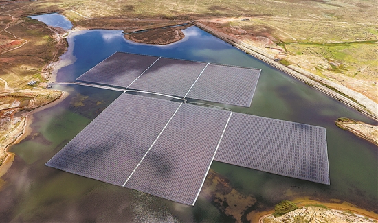 這是8月20日拍攝的位于寧夏靈武市馬家灘鎮(zhèn)的一處漂浮分布式光伏發(fā)電項目。