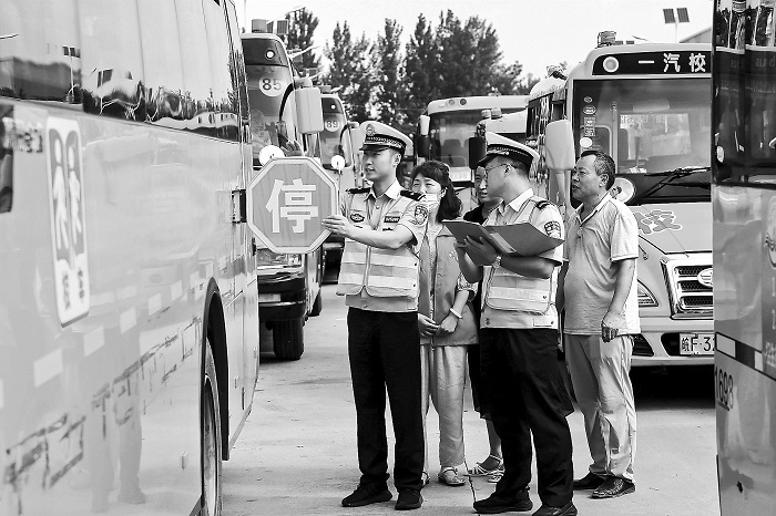 8月20日,安徽省淮北市公安局交警支隊四大隊民警對轄區(qū)一家校車服務(wù)有限公司的校車進行安全檢查,保障學(xué)生乘車安全。本報通訊員 萬善朝 攝