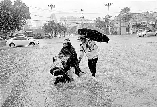 8月19日,山東省滕州市突降大雨,城區(qū)道路積水嚴(yán)重,滕州市公安局交警大隊(duì)組織警力走上路面,做好暴雨天氣道路交通疏導(dǎo)管控和群眾救助工作。