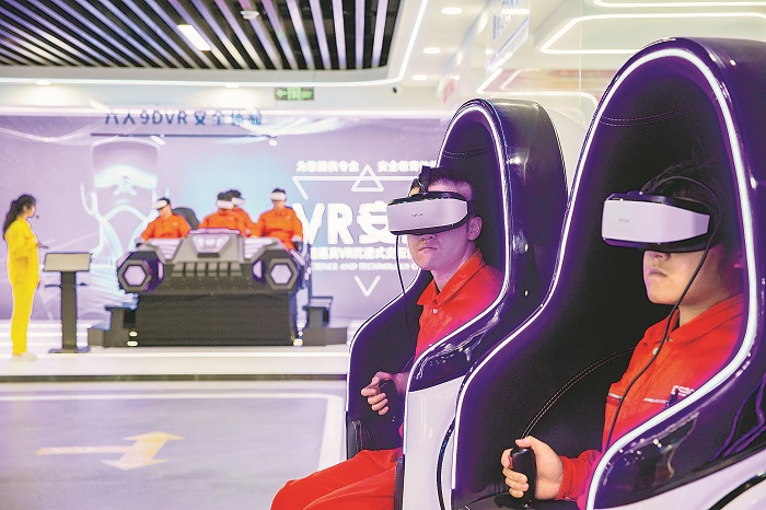 8月21日,在中國能建易普力股份有限公司新疆準(zhǔn)東經(jīng)濟(jì)技術(shù)開發(fā)區(qū)的智能化安全體驗培訓(xùn)中心,新入職職工正進(jìn)行崗前培訓(xùn),通過VR模擬爆破飛石、排土場翻車事故等警示案例,提高職工安全生產(chǎn)意識。近年來,中國能建易普力公司在新疆準(zhǔn)東宜化五彩灣一號露天煤礦進(jìn)行智能化設(shè)備改造,推進(jìn)礦山向智能化、綠色化轉(zhuǎn)型。本報記者 王偉偉 攝