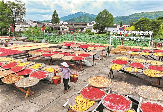 進入秋季,安徽省黃山市徽州區(qū)呈坎村村民趁著晴好天氣,晾曬玉米、南瓜、紅辣椒等農(nóng)作物,吸引不少游客前往觀賞,感受豐收的喜悅,也增加了村民的收入。