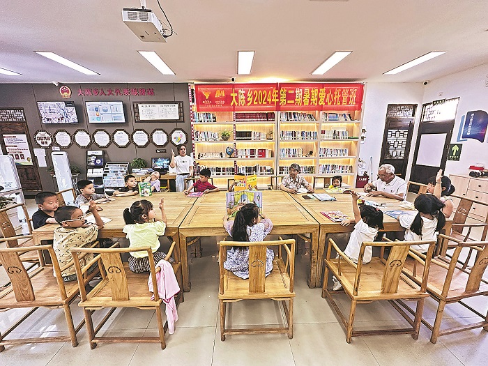 為讓留守兒童度過安全快樂的暑假,今年暑假期間,浙江衢州江山市大陳鄉(xiāng)利用新時代文明實踐站,開辦閱讀、書法、繪畫等公益課堂,邀請退休教師等進(jìn)行免費(fèi)授教。圖為退休教師正在與留守兒童一起讀繪本。本報通訊員 祝海青 攝