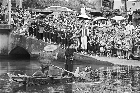 8月18日,在廣西壯族自治區(qū)柳州市融水苗族自治縣汪洞鄉(xiāng),村民們在改造后的河道上進行“劉三姐河上實景演出”,展示當(dāng)?shù)赝七M民族文化旅游產(chǎn)業(yè)發(fā)展、助力鄉(xiāng)村振興的成果。