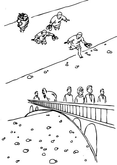 漫畫《變遷》,與很多我們常見(jiàn)的漫畫作品不同。何富成先生看似沒(méi)有直接諷刺和批判什么現(xiàn)象,也沒(méi)有刻意營(yíng)造幽默情境,這幅作品動(dòng)人之處,在于何先生不動(dòng)聲色的敘述,如同那條默默阻截人們出行而后又默默隱退的河水與河。