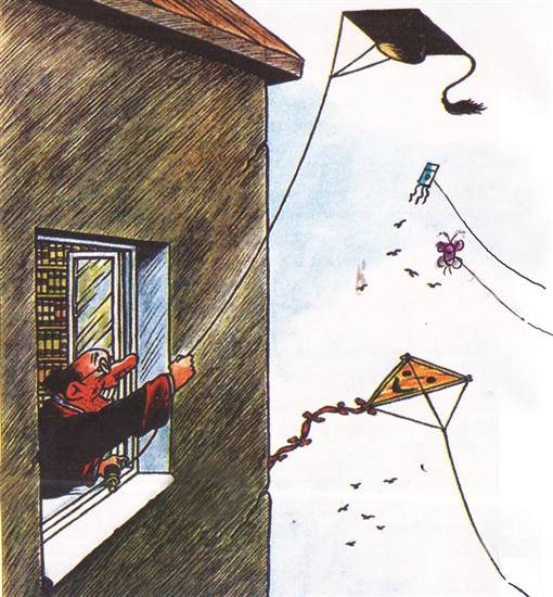 時(shí)下正是放風(fēng)箏的季節(jié),各式牽線的紙鳶爭奇斗艷,碧藍(lán)的天空頓時(shí)熱鬧起來。不甘寂寞的教授找出博士帽代替了“飛行器”。