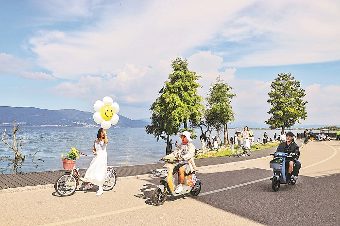 8月21日,在云南大理洱海生態(tài)廊道,游客騎行洱海湖畔,拍照打卡,感受生態(tài)美景。