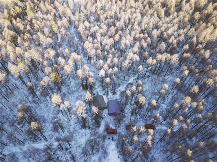圖為在黑龍江省漠河市北極鎮(zhèn)拍攝的北極村周邊一處漠河林場(chǎng)作業(yè)點(diǎn)。新華社記者 石楓 攝