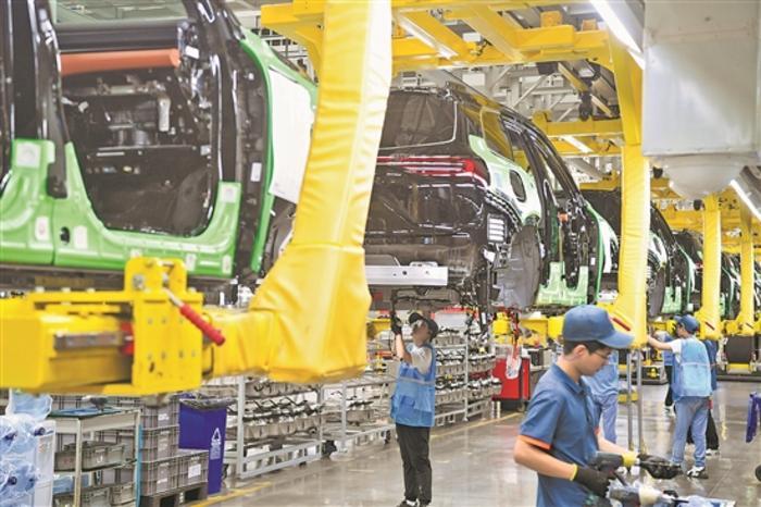 圖為在賽力斯汽車?guó)P凰智慧工廠拍攝的新能源汽車生產(chǎn)線。新華社記者 王全超 攝