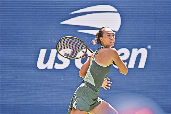 當(dāng)?shù)貢r間8月26日,鄭欽文在比賽中回球。
