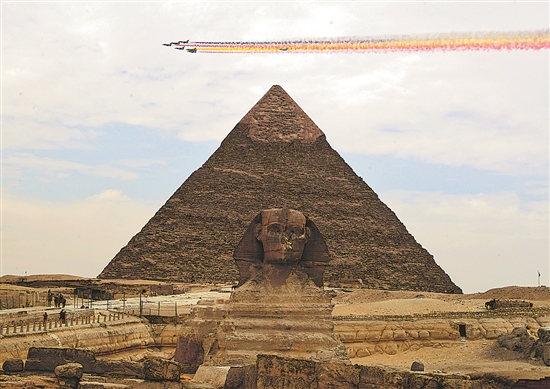圖為受邀參加首屆埃及航展的中國空軍運-20與殲-10表演機(jī)編隊飛越金字塔,為中埃兩國友誼留下歷史見證。