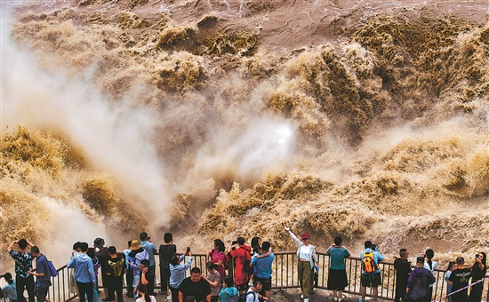 8月19日,陜西省宜川縣黃河壺口瀑布迎來瀑布群全景模式,游人在黃河壺口拍照留念。本報(bào)通訊員 趙嘵罡 攝
