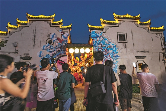 8月10日晚,在浙江省金華市金東區(qū)“歸鄉(xiāng)·坡陽夜肆”,游客們暢游古街,感受市井繁華。本報(bào)通訊員 胡肖飛 攝