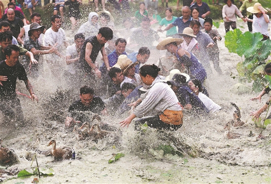 8月27日,在貴州省從江縣洛香鎮(zhèn)四聯(lián)侗寨,一場荷塘搶鴨摸魚活動(dòng)正在舉行,吸引了眾多游客前來體驗(yàn)。本報(bào)通訊員 梁輝波 攝