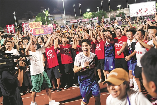 8月24日,在貴州省榕江縣,巴黎奧運(yùn)會跳水男子雙人3米板冠軍龍道一在村超球場演唱自創(chuàng)歌曲《場壩街的崽》。本報(bào)通訊員 王炳真 攝