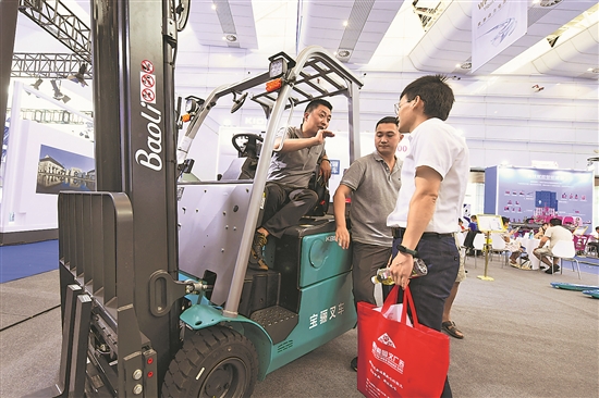 9月1日,在世界動力電池產業(yè)鏈供應鏈成果展示活動現(xiàn)場,參展商向參會者介紹鋰電池平衡重式叉車。