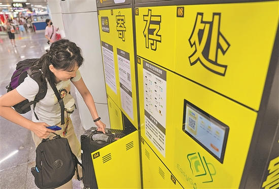 9月2日,一名來自北京的游客將行李存入杭州地鐵5號線城站站的自助寄存柜內(nèi)。
