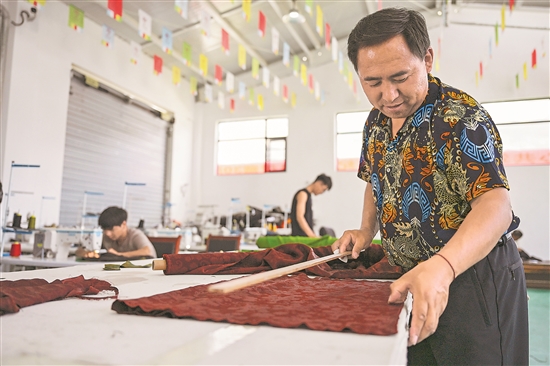 9月1日,在西藏日喀則市仁布縣特色產(chǎn)業(yè)孵化園,亞德細(xì)褐羊毛織品農(nóng)民專業(yè)合作社工作人員在車間里準(zhǔn)備剪裁布匹。