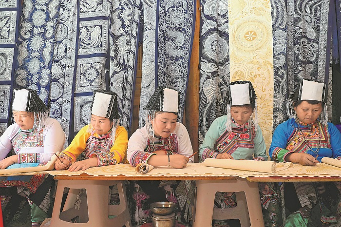 9月2日,在貴州省黔東南苗族侗族自治州榕江縣三江鄉(xiāng)喬來村,苗族婦女在畫蠟畫。