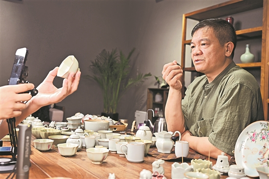 在位于江西省景德鎮(zhèn)市善窯廠的工作室里,李善明在通過直播介紹自己的汝瓷產(chǎn)品(8月28日攝)。