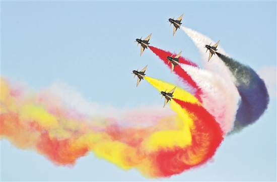 埃及首屆國際航展近日在地中海南岸的埃及濱海城市阿拉曼國際機場拉開帷幕。圖為中國空軍八一飛行表演隊在埃及航展上進行飛行表演。