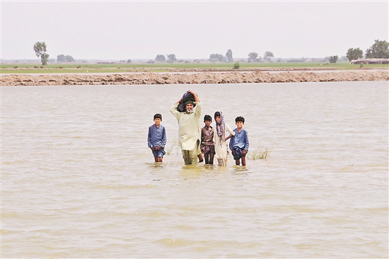 圖為近日,在巴基斯坦南部信德省的達杜地區(qū),人們在被洪水淹沒的區(qū)域行進。新華社發(fā)(賈恩·阿里 攝)