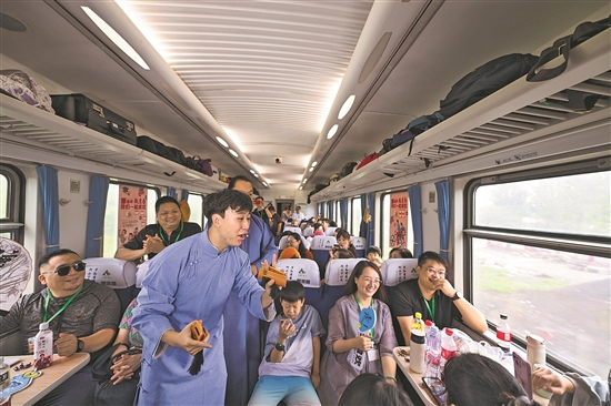 9月7日,相聲演員在S910列車上為旅客表演快板。
