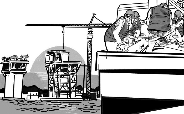 屈大哥咧嘴一笑,牙真白。他說,能晃動的橋墩才是好橋墩,才能真正抵抗狂風巨浪。他們在秀山島的一側(cè)已經(jīng)建了一根又一根巨大的橋墩。夏季有臺風,施工是有窗口期的。趕上好天氣,他就和兄弟們加班加點,吃住都在橋墩上。