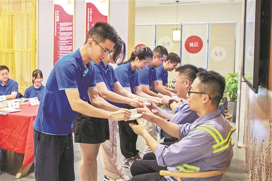 8月30日,浙江省寧波舟山港股份有限公司北侖礦石碼頭分公司舉行2024年新入職大學(xué)生“導(dǎo)師帶徒”培養(yǎng)計(jì)劃啟動儀式,12名新員工與結(jié)對導(dǎo)師簽訂師徒協(xié)議。圖為徒弟向?qū)熅床琛?/p>