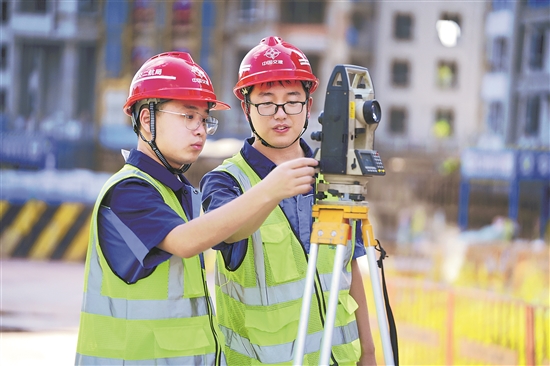在中交二航局中交錦上項(xiàng)目工地上,工程師余訓(xùn)毅教導(dǎo)徒弟王英東,要利用好自己手中的全站儀,不僅精準(zhǔn)測(cè)量建筑物,也測(cè)好人生標(biāo)高,找準(zhǔn)發(fā)展定位。圖為王英東(左)在師傅余訓(xùn)毅的指導(dǎo)下檢測(cè)塔吊垂直度。方國(guó)俊 攝