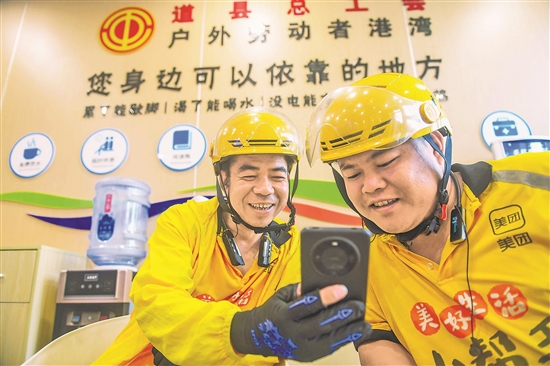 近日,外賣配送員在湖南省永州市道縣月巖西路戶外愛心驛站休息。近年來,道縣充分發(fā)揮工會優(yōu)勢,形成“黨群服務(wù)陣地+愛心驛站”“商圈企業(yè)+愛心驛站”等“驛站+”建設(shè)模式。驛站里配備微波爐、飲水機、應(yīng)急醫(yī)藥箱、充電插座等服務(wù)設(shè)施,為快遞員、外賣配送員、環(huán)衛(wèi)工人等戶外勞動者提供便利“歇腳地”。本報通訊員 蔣克青 李猛慶 攝