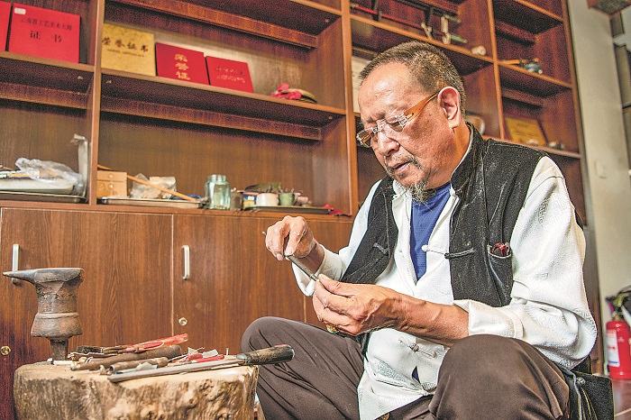 2011年,烏銅走銀制作技藝被列入第三批國家級非物質(zhì)文化遺產(chǎn)名錄,它與景泰藍(lán)齊名,一南一北,并稱“天下銅藝雙絕”。近日,記者到昆明官渡古鎮(zhèn)烏銅走銀傳習(xí)館,拜訪了館長、國家級非遺傳承人、云南省云嶺工匠金永才,跟隨這位烏銅走銀第六代傳承人品味他的“三品”人生。