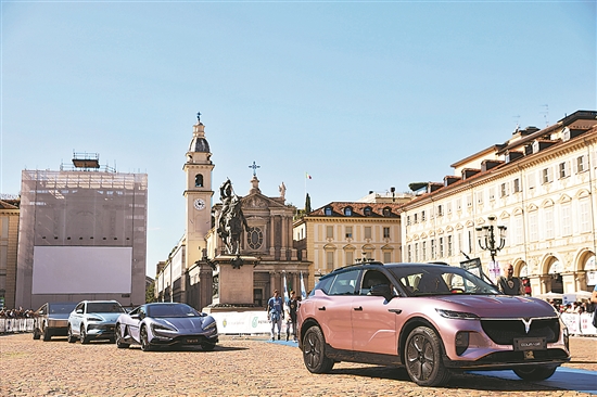 圖為當(dāng)?shù)貢r(shí)間9月13日在意大利都靈圣卡洛廣場(chǎng)拍攝的參展車。新華社記者 李京 攝