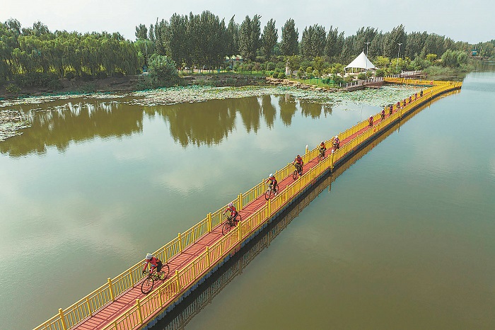 近日,騎行愛好者在山東省滕州市九龍灣濕地公園健身騎行。該濕地公園原屬一處煤礦塌陷地區(qū)域,當(dāng)?shù)貓猿稚鷳B(tài)保護優(yōu)先的原則,在煤礦塌陷地培育出生態(tài)觀光、光伏新能源、種植養(yǎng)殖等業(yè)態(tài)。本報通訊員 孫楊 攝