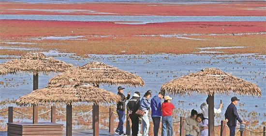 9月14日,游客在遼寧省錦州市凌海市紅海灘國(guó)家風(fēng)景廊道欣賞紅海灘。