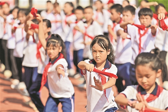 在梧州市長洲區(qū)龍平小學(xué),學(xué)生們在陽光大課間進(jìn)行武術(shù)練習(xí)(9月19日攝)。
