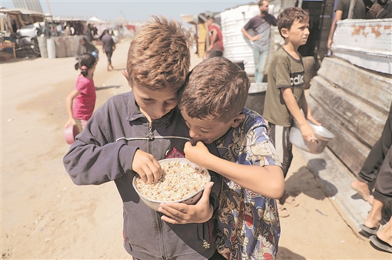 以色列對加沙地帶采取的軍事行動已持續(xù)近一年,在該地區(qū)造成超過4.1萬巴勒斯坦人死亡,加沙地帶230萬人口大多流離失所。眼下,上百萬難民在加沙地帶南部以方劃設的所謂人道主義“安全區(qū)”躲避戰(zhàn)火。那里僅占加沙地帶總面積的15%,食物和醫(yī)療資源匱乏,不時遭到以軍轟炸。圖為近日在加沙地帶南部汗尤尼斯,巴勒斯坦兒童領取救助食物后迫不及待隨手取食。新華社發(fā) (里澤克·阿卜杜勒賈瓦德 攝)