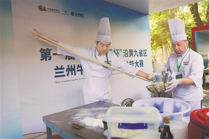 9月26日,第一屆沿黃九省區(qū)蘭州牛肉拉面職業(yè)技能大賽舉行,來(lái)自甘肅敦煌的選手在展示驢肉黃面制作技藝。