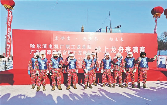 哈爾濱與順德職工冰上龍舟表演賽。