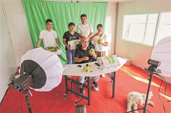9月25日上午,江蘇省南京市棲霞區(qū)八卦洲壩上鮮果園,徐磊(圖中)和他的團(tuán)隊(duì)在抖音平臺(tái)直播賣農(nóng)產(chǎn)品。