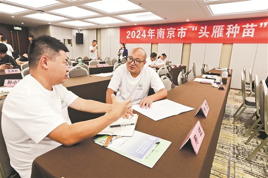 9月25日,在南京農(nóng)業(yè)大學(xué)“頭雁種苗”培育助飛項(xiàng)目培訓(xùn)班上,徐磊(圖右)和種植大戶的周誠(chéng)討論葡萄保鮮的方法。