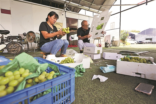 江蘇省南京市棲霞區(qū)八卦洲壩上鮮果園,徐磊(圖右)和妻子一起打包葡萄準(zhǔn)備發(fā)貨。