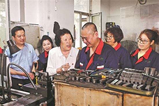7月12日,遼寧沈陽(yáng),尉鳳英(左三)走進(jìn)沈陽(yáng)君威新能科技有限公司,在車間與一線車床工人交流。