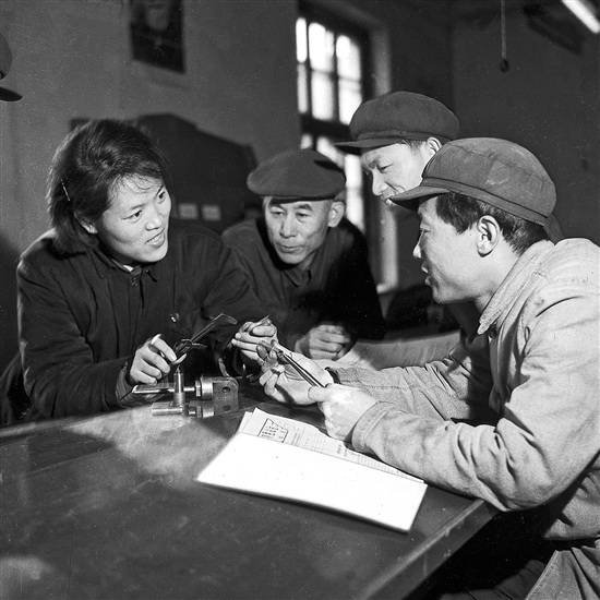 1964年3月,遼寧沈陽(yáng),尉鳳英(左一)和技術(shù)革新紅專大隊(duì)的工人一起在研究有色金屬冷擠壓加工的技術(shù)革新項(xiàng)目。工人日?qǐng)?bào) 蔡壯田 攝