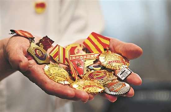 7月12日,遼寧沈陽(yáng),尉鳳英在家中捧著獎(jiǎng)?wù)轮v述過(guò)去的故事。