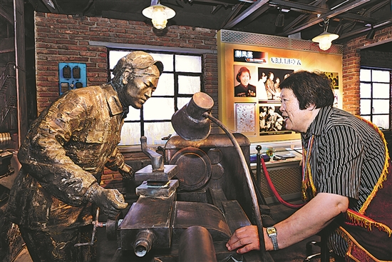 2016年6月16日,遼寧沈陽(yáng),沈陽(yáng)勞動(dòng)模范紀(jì)念館開館,尉鳳英在自己的雕像前憶當(dāng)年。