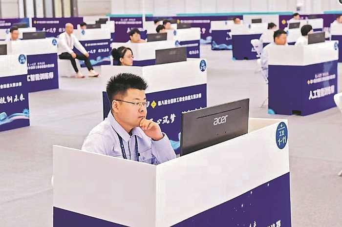 圖為藺金泉在第八屆全國職工職業(yè)技能大賽決賽人工智能訓(xùn)練師賽項比賽現(xiàn)場。張磊 攝