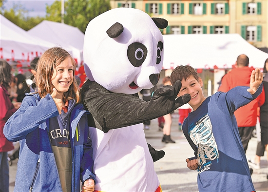 在瑞士伯爾尼“遇見中國”文化節(jié)上,孩子們與扮成大熊貓的工作人員合影。新華社記者 連漪 攝
