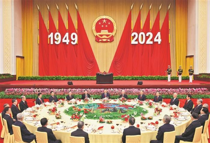 人民大會(huì)堂宴會(huì)廳華燈璀璨,洋溢著喜慶熱烈的節(jié)日氛圍。主席臺(tái)上方高懸著莊嚴(yán)的國(guó)徽,“1949-2024”大字年號(hào)在鮮艷紅旗映襯下格外醒目。
